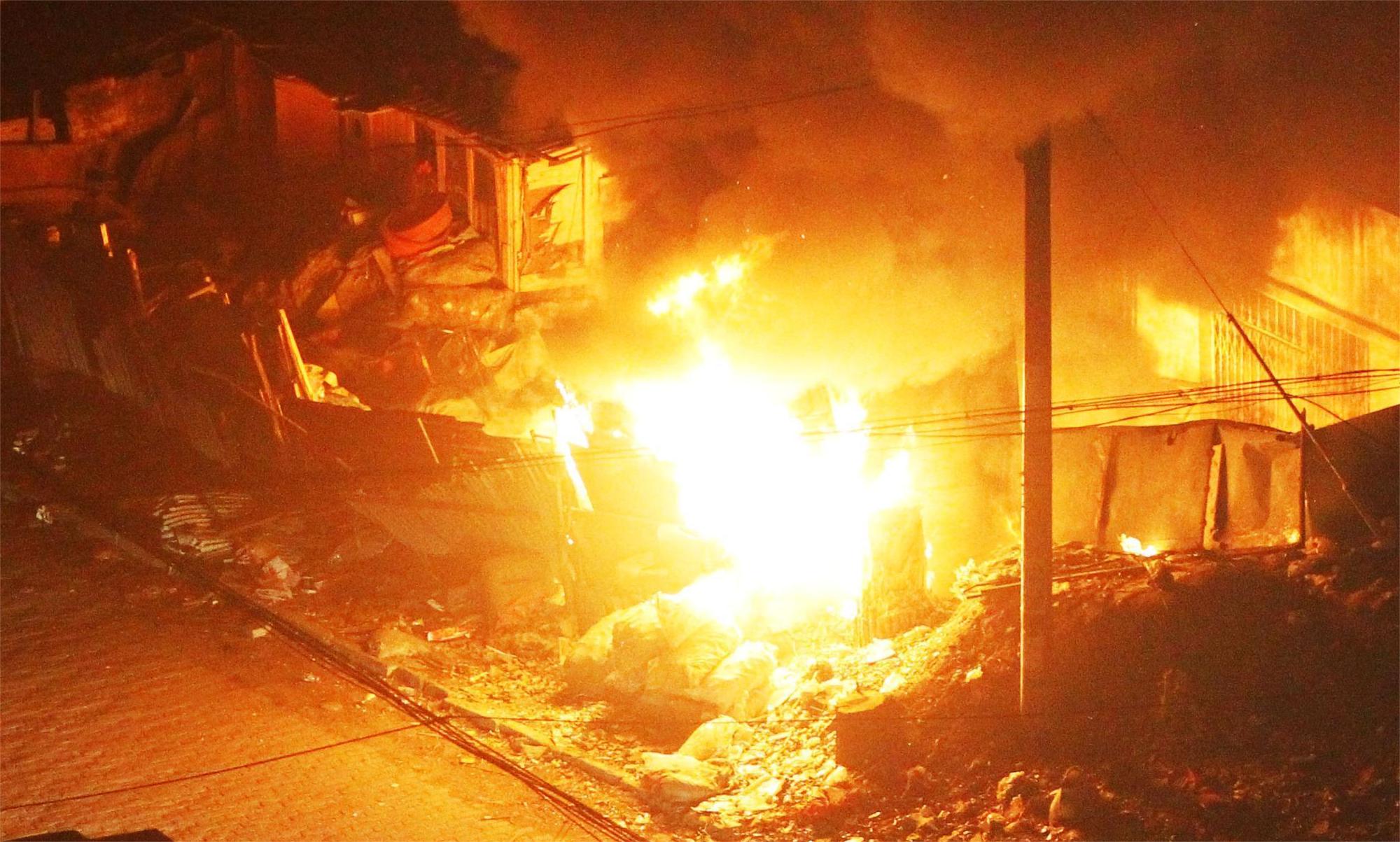 因施工人員違規(guī)動火施工造成起火,因火勢太大無法及時撲滅,濃煙通過樓道涌入至二樓