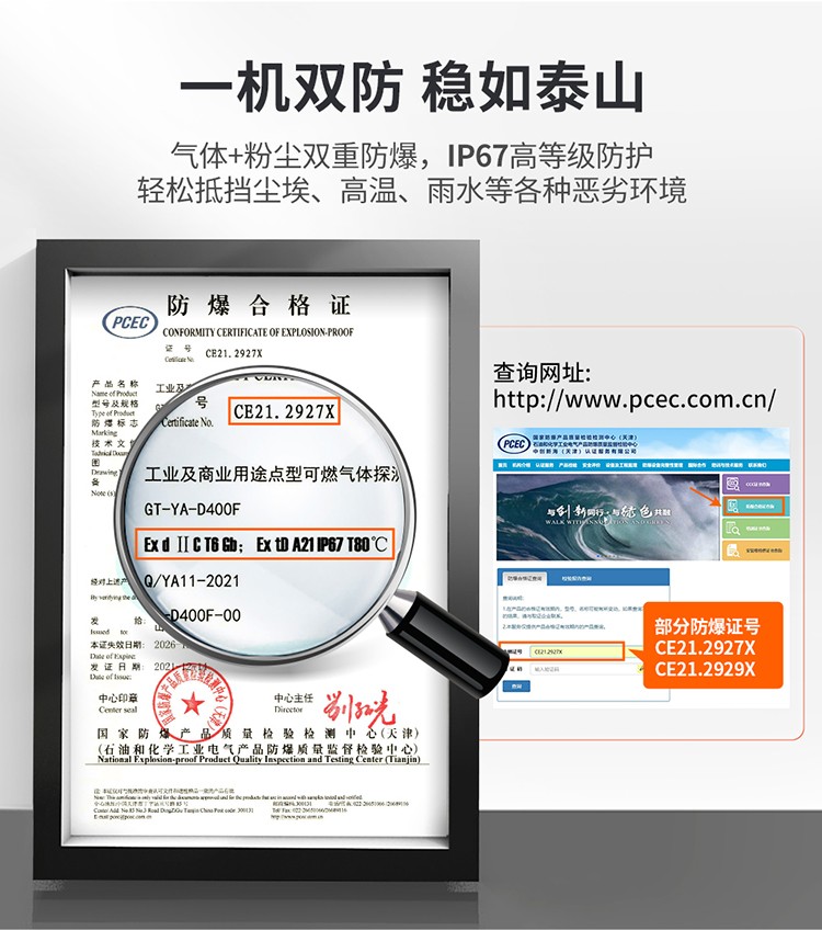 以瑤安YA-D400氣體報(bào)警器為例,防爆標(biāo)識(shí):Ex d IIC T6 Gb;Ex tD A21 IP67 T80℃,滿足氣體+粉塵雙環(huán)境防爆,IP67高防護(hù)等級(jí),耐腐蝕、高溫、低溫、高濕、沙塵、雨水環(huán)境能力出眾,惡劣條件下適應(yīng)性更強(qiáng),優(yōu)于市面上大部分同類產(chǎn)品。氣體報(bào)警器產(chǎn)品在出廠前會(huì)歷經(jīng)跌落試驗(yàn)、高溫試驗(yàn)、低溫試驗(yàn)、防水試驗(yàn)、長(zhǎng)期穩(wěn)定性試驗(yàn)、抗氣體干擾性等嚴(yán)苛性能測(cè)試,從源頭保障產(chǎn)品的高可靠性,為企業(yè)安全生產(chǎn)保駕護(hù)航。總之,我們?cè)诖_定產(chǎn)品防爆標(biāo)志時(shí),應(yīng)綜合考慮到實(shí)際應(yīng)用要求中的各種具體因素,使確定的防爆標(biāo)志安全、可靠、經(jīng)濟(jì)、合理。